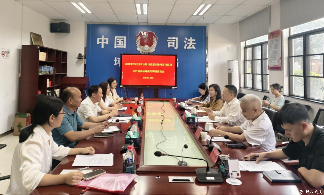 最后,两地司法局开展了调研座谈会。座谈会上,坪山区司法局白宁局长全面介绍了坪山区法治建设总体情况,重点分享了公共法律服务体系建设、基层社会治理创新、行政执法监督改革、行政复议争议化解等经验做法。与会人员围绕“如何发挥结对优势补齐基层法治短板”展开热烈讨论,就法治人才联合培养、跨区域法律服务协作、智慧司法资源共享等达成初步共识。